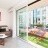- A living room with sofa couch with large windows that open onto the terrace with sea view