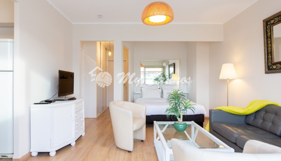 - A main room with 2 areas: first, a living room area with armchairs and a sofa that can be transformed into a single bed, second, a sleeping area with a double bed and TV