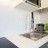 A US kitchen with electric glass cooktop, microwave, kettle, toaster, coffee machine