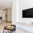 A living room with sofa couch, flat screen TV. The living room opens onto the terrace.