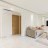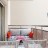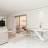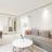 A living room with sofa couch with large windows that open onto the terrace with south orientation , air conditioning