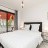 A bedroom with a double bed and cupboard, access to another terrace