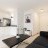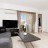 A living room with sofa couch with windows that open onto the terrace. Coffee table that can be set up in tall position.