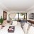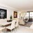A living room with couch, armchairs, flat screen TV & dining area with table and chairs. Air conditioning.