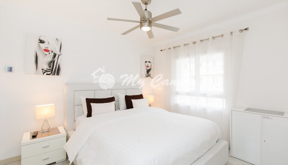 A master bedroom with 1 double bed, flat screen TV & cupboard