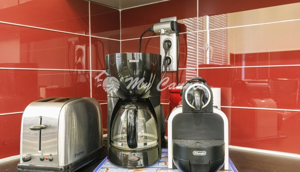 A semi-independant kitchen all equipped with coffee machine, oven, microwave, refrigerator, freezer, ceramic glass cooktop