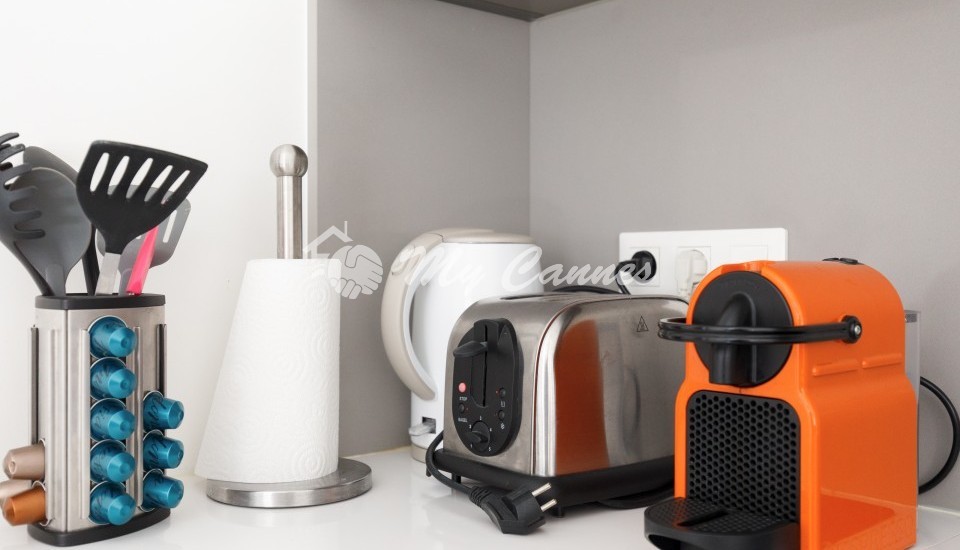 A US fitted kitchen with Nespresso machine, kettle, toaster, microwave
