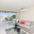 - A living room with sofa couch with large windows that open onto the terrace with West orientation (sun in the afternoon & evening)