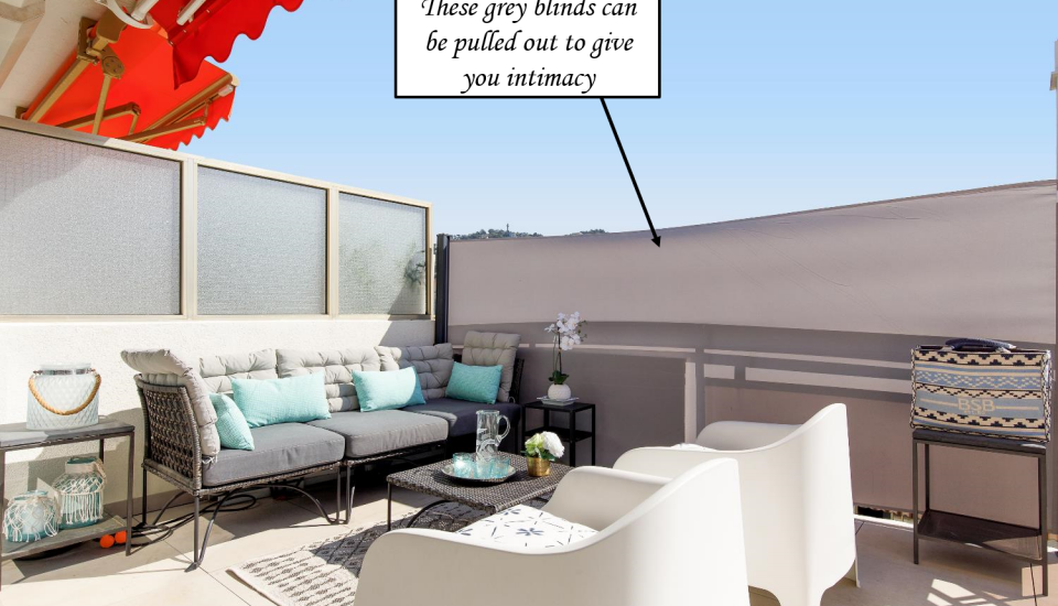 A very large terrace of 20sqm with lounge area, dining table and chairs