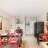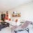 - A living room with a long couch, a "Le Corbusier" chair, flat screen TV & dining area with table and chairs. Air conditioning. The living room opens onto a balcony.
