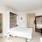 - A main room with a very nice sofa couch that sleeps two persons, a flat screen TV on the wall, large mirror, and a dining area with table and chairs. The dining area is in front of large windows that give a lot of brightness to the room.